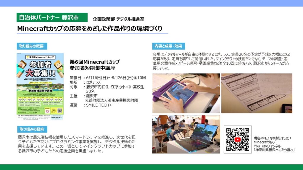 南関東ブロックでは、「神奈川県 藤沢市」「神奈川県 葉山町」に自治体パートナーとして、Minecraftカップを応援いただいています。