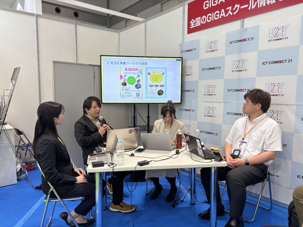 初日には、ICT CONNECT21ブースにて、教育現場での「教育版マインクラフト活用事例」について、3人の先生とともにご紹介しました。
