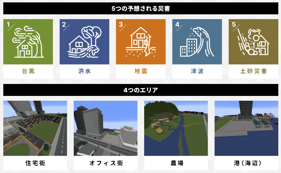 防災ワールドでは、5つの災害が起こることが予想されています。また、人々が生活や仕事を行う4つのエリアがあります。