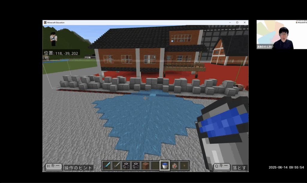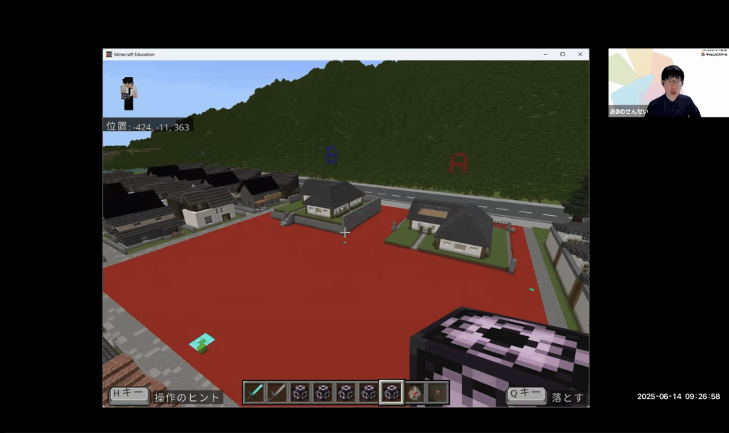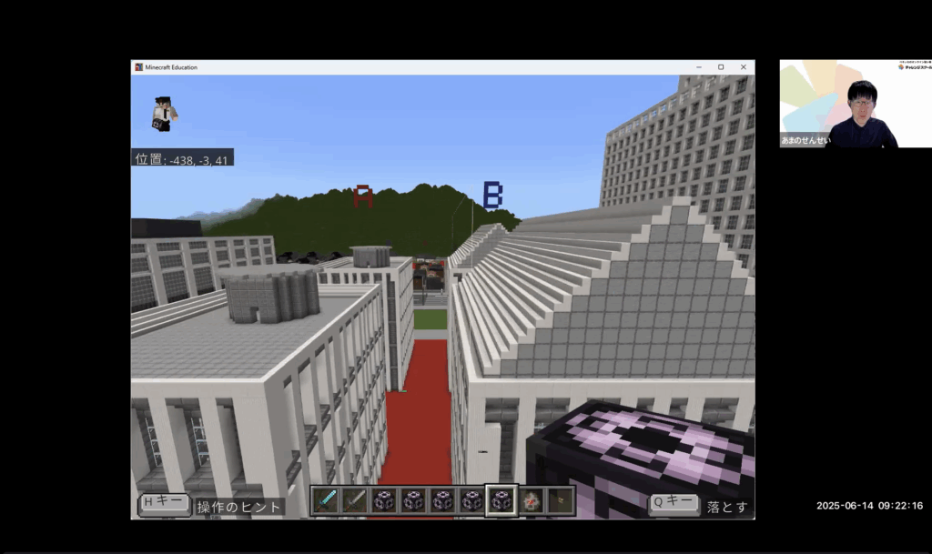 講座で使用されたのは、第7回Minecraftカップ「たてもの部門」の作品づくりで使用する「防災ワールド」です。