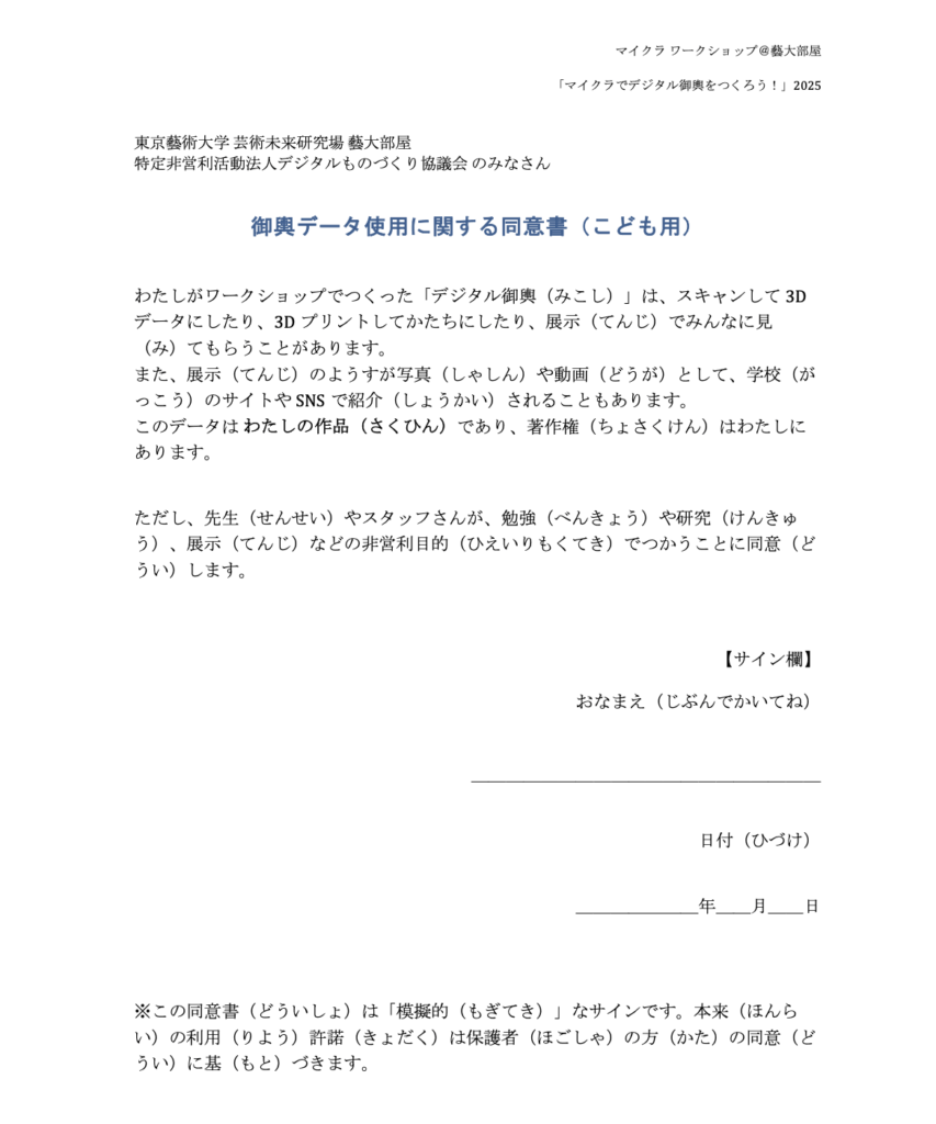 子どもたちは、運営が用意した「御輿データ使用に関する同意書(こども用)」にサインを行い、模擬的にではありますが、11月に予定している展示に自分の作品を出展する許可をくだしました。