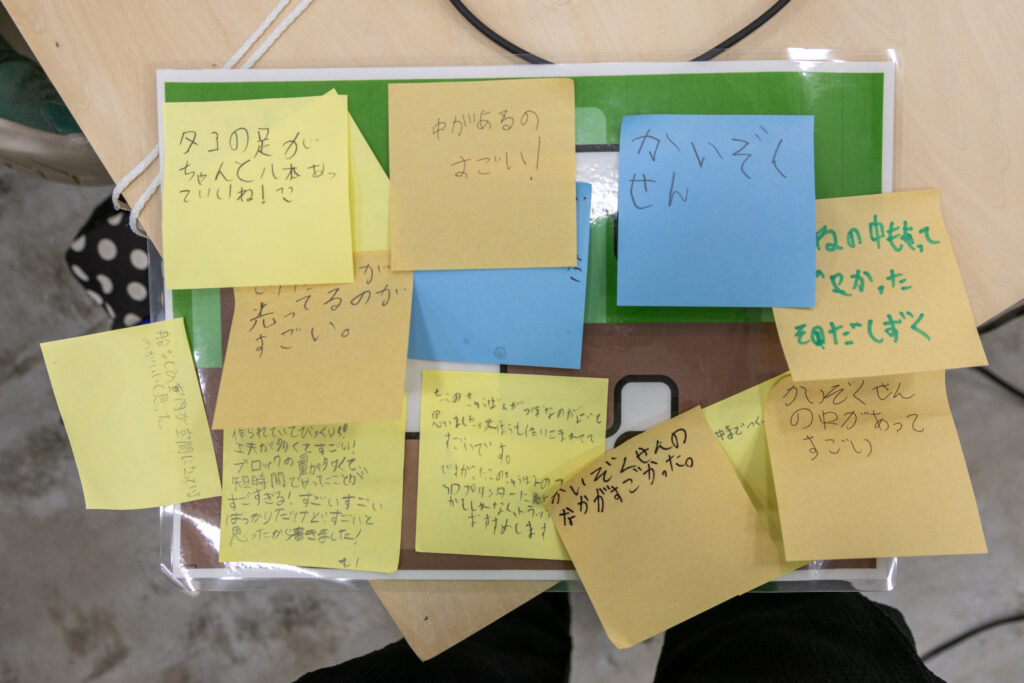 他グループの作品の良いところを真剣に探し、付箋にコメントを書いて共有しました。