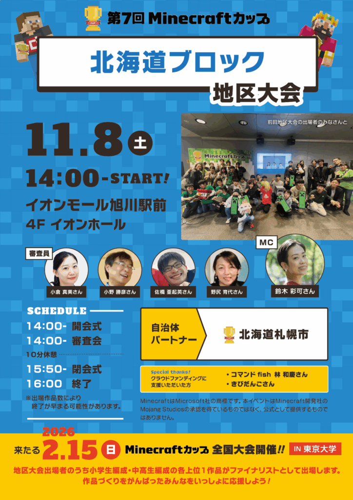 11月8日に「イオンモール旭川駅前」で、第7回Minecraftカップ まちづくり部門地区大会 北海道ブロックを開催しました!