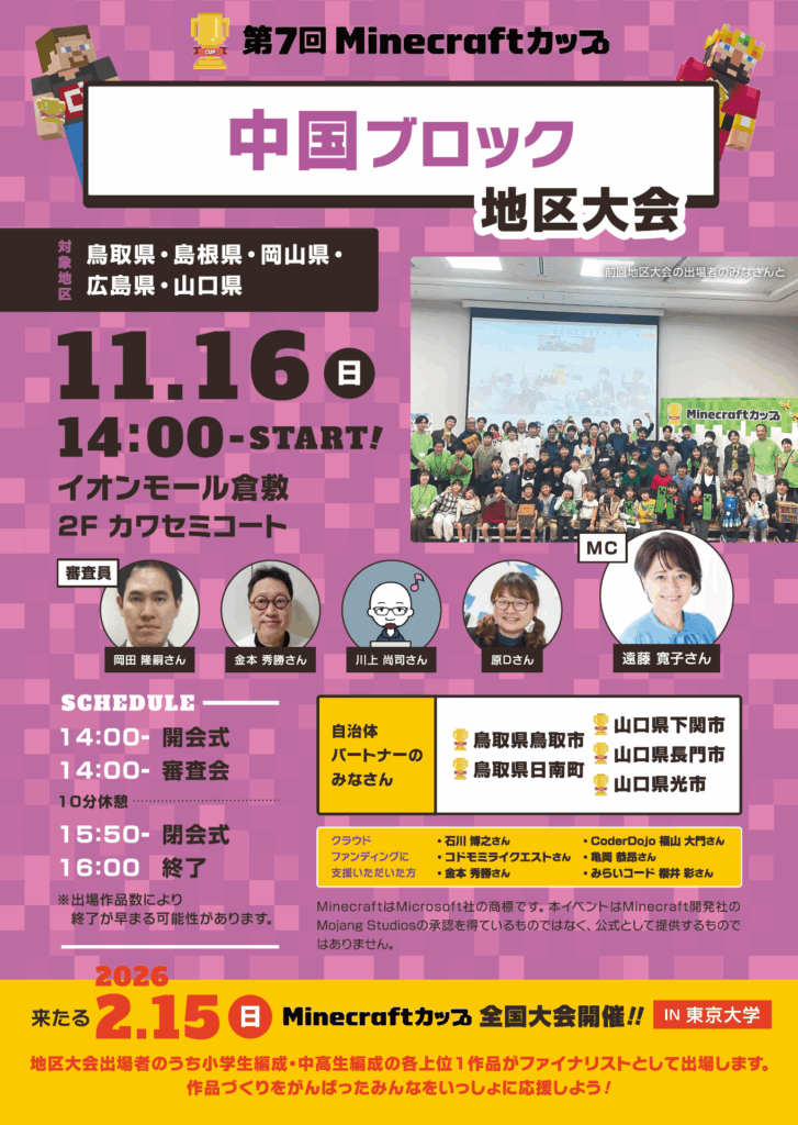 11月16日に「イオンモール倉敷」で、第7回Minecraftカップ まちづくり部門地区大会 中国ブロックを開催しました!