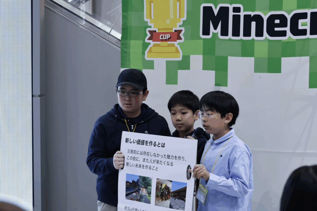 戦後80年、阪神・淡路大震災から30年という節目を迎えることから、「災害に立ち向かう力」をテーマに、教育版マインクラフトを使った作品づくりに取り組んでもらいました。