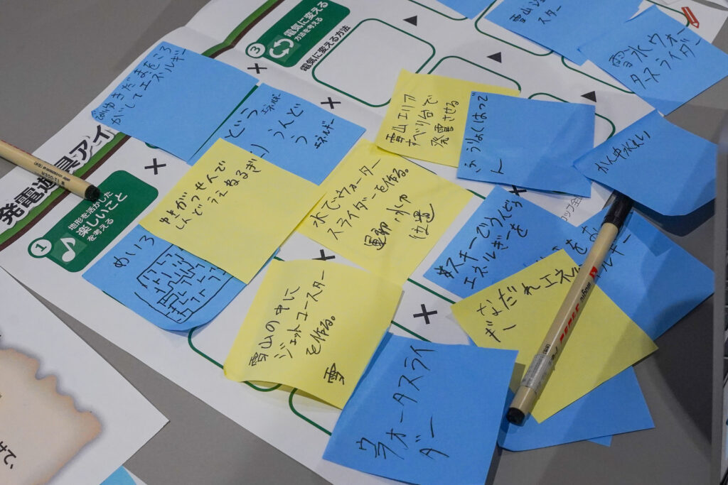 「電気を生み出す公園をつくろう!」をテーマに、発電の仕組みやエネルギーについて学んだ後は、マル秘資料やワークシートをヒントに、どんな公園を作るかをグループで話し合います。