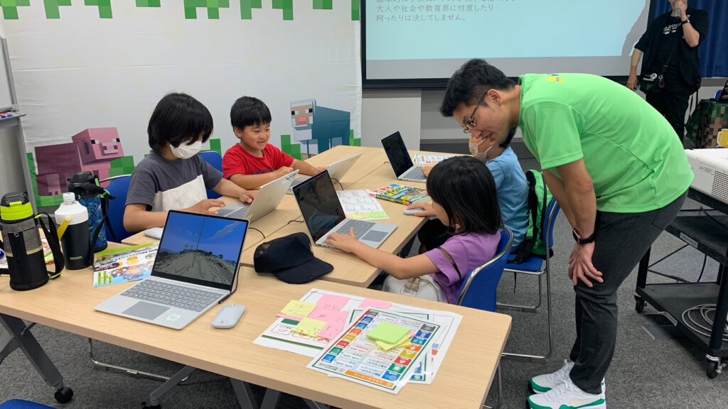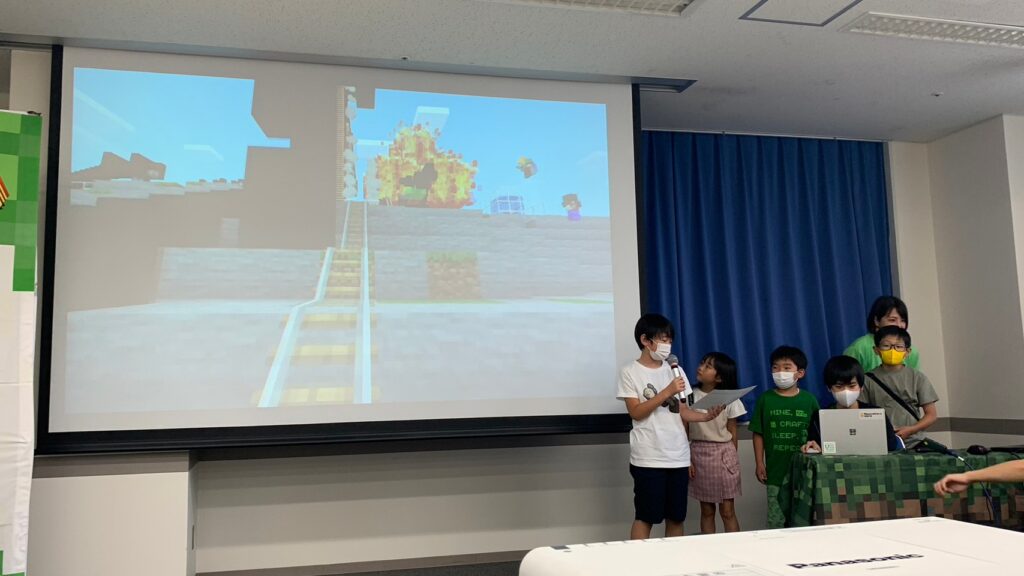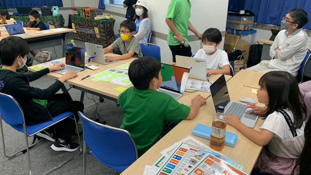 参加者の中には、教育版マインクラフトの特徴のひとつでもあるMakeCode(ビジュアルプログラミング)を使いこなせる子も多く、大規模な遊具づくりに挑戦するチームや、さまざまな種類の遊具をつくるチームが目立ちました。