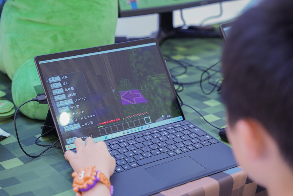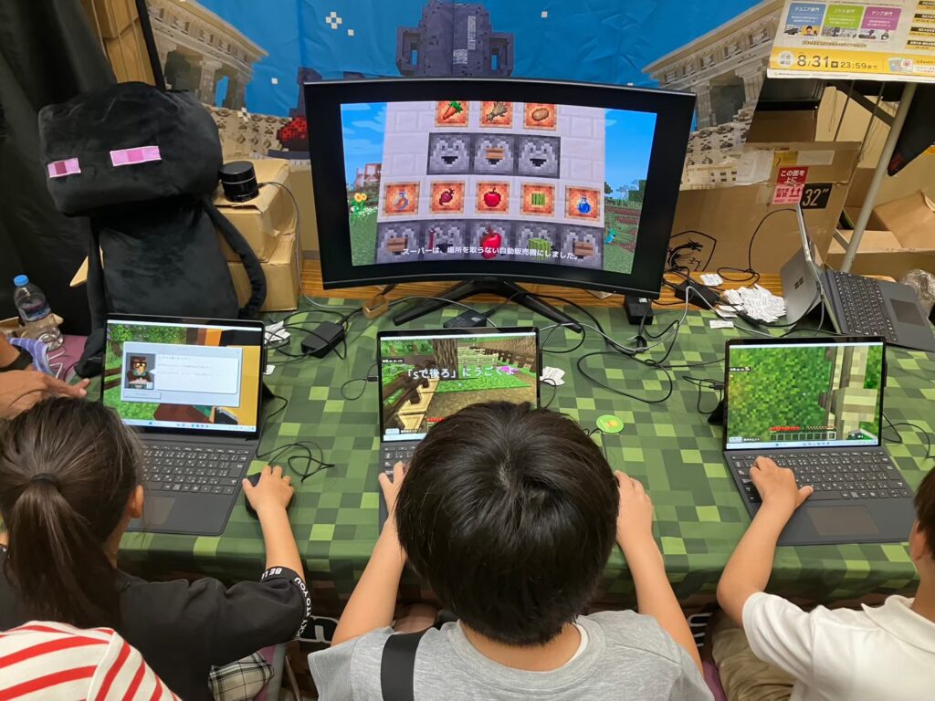 子ども達にパソコンで忍者ワールドを探検してもらいながら、基本操作に慣れてもらったり、教育版マインクラフトのおもしろさを体験してもらいました。