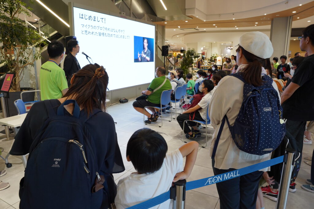 ワークショップは、3階のイオンホールと、1階センターコートの2会場で実施し、午後からは日本初のプロマインクラフターであるタツナミシュウイチ先生の講演会・サイン会も行われました。