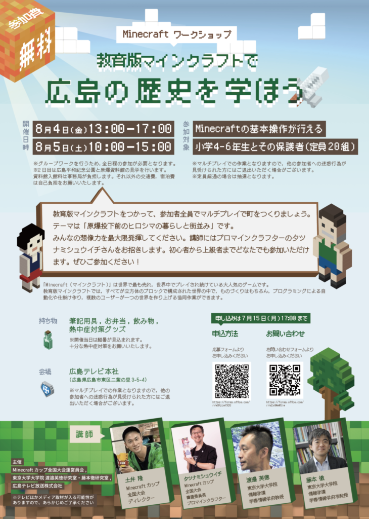 本ワークショップは、Minecraftカップと東京大学大学院 渡邉英徳研究室・藤本徹研究室、広島テレビの共同で行われました。