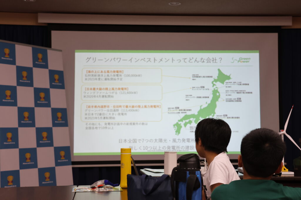 午後は、岩泉町の風力事業を運営する株式会社グリーンパワーインベストメントから「なぜ風力発電が必要なのか」「どのように建設をするのか」などをお話しいただきました。