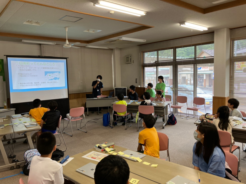 ワークショップ前半では、地域づくり推進課の方から日南町についてのレクチャーがあり、日南町の魅力やまだまだ足りていない点について、子ども達と一緒に考えました。