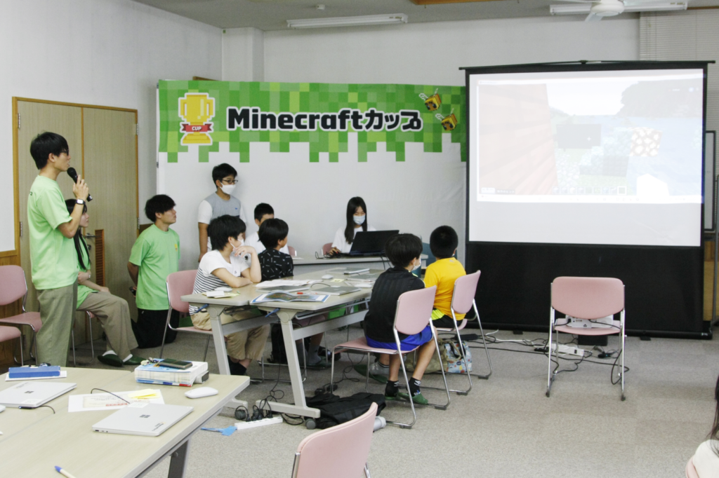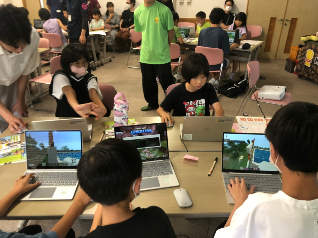 お昼休憩をはさんでワークショップ後半では、前半で考えたアイデアをもとに、教育版マインクラフトで制作を実施。