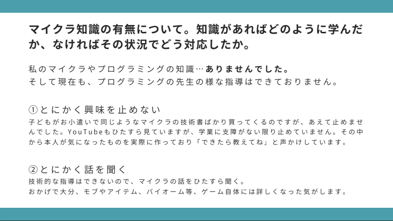 その中でお話しいただいた伊藤さんからは、「マイクラの知識が無いなりのサポート方法」や「応募する際に困ったポイントと対策」などについて、お話いただきました。