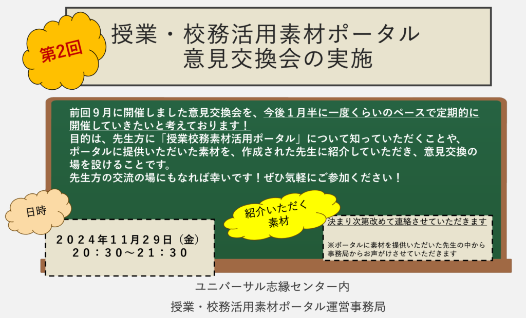 11月29日に、オンラインで「授業・校務活用素材ポータル意見交換会」を実施します。