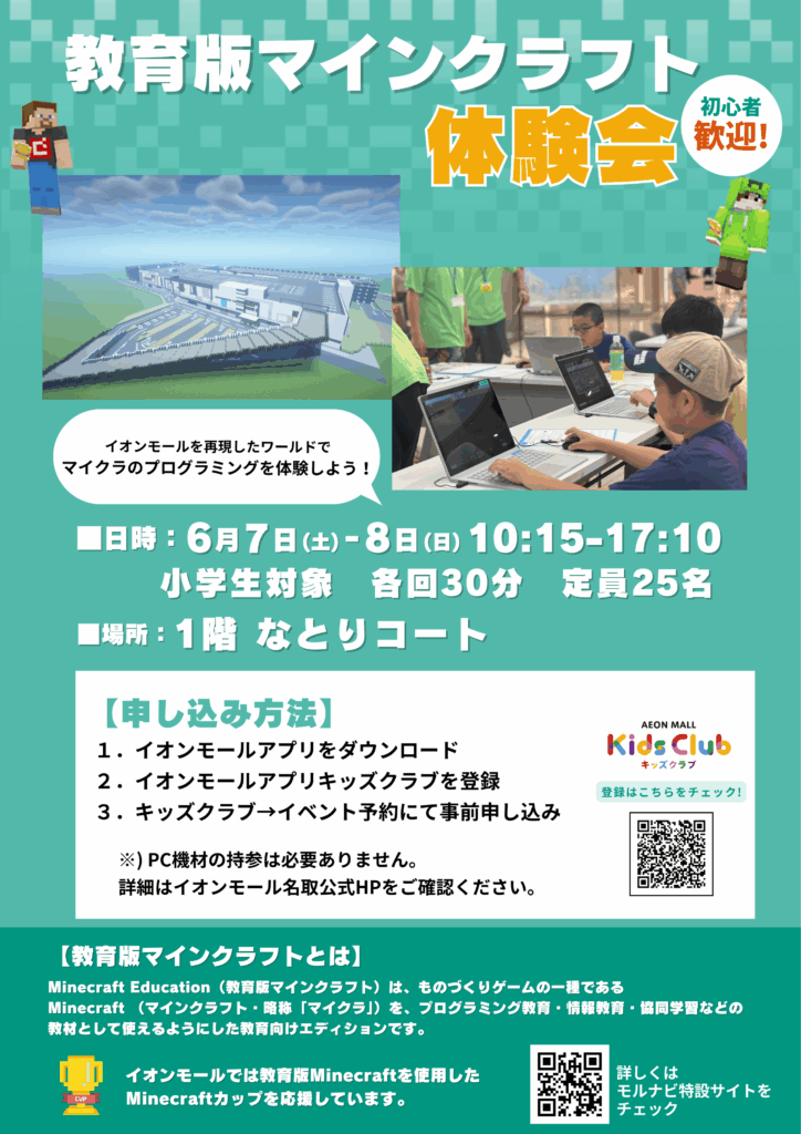 6月7日・8日に宮城県「イオンモール名取」にて教育版マインクラフト体験会を開催します【申し込み受付中】