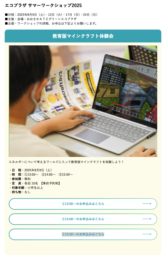 「おおさかATCグリーンエコプラザ」にて、教育版マインクラフト体験会を開催します