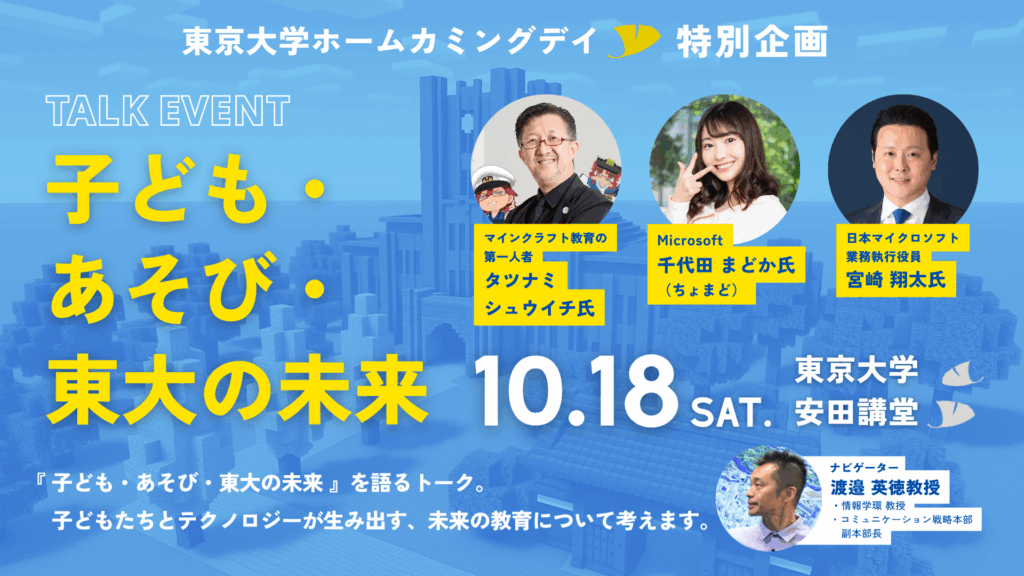 10月18日「東京大学 安田講堂」にて東京大学ホームカミングデイ特別企画「子ども・あそび・東大の未来」トークイベント&「教育版マインクラフト体験会」を開催します