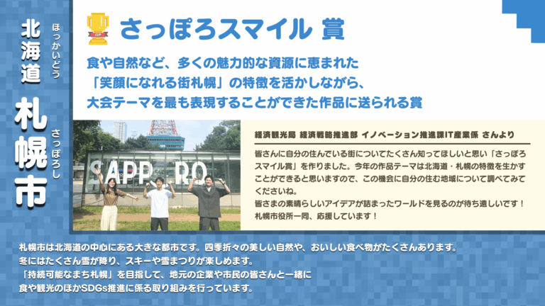 | 審査方法 | 各地区の会場で1 チーム毎に、以下の内容を発表する審査会方式。 ①1分間の作品紹介動画の再生 ②2分間のスピーチによるプレゼンテーション ③審査員からの質疑応答 |