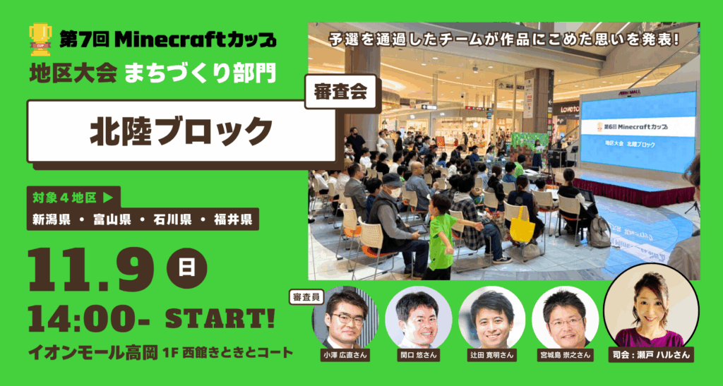 富山県にある「イオンモール高岡」にて、第7回Minecraftカップまちづくり部門地区大会 北陸ブロックを開催いたします。