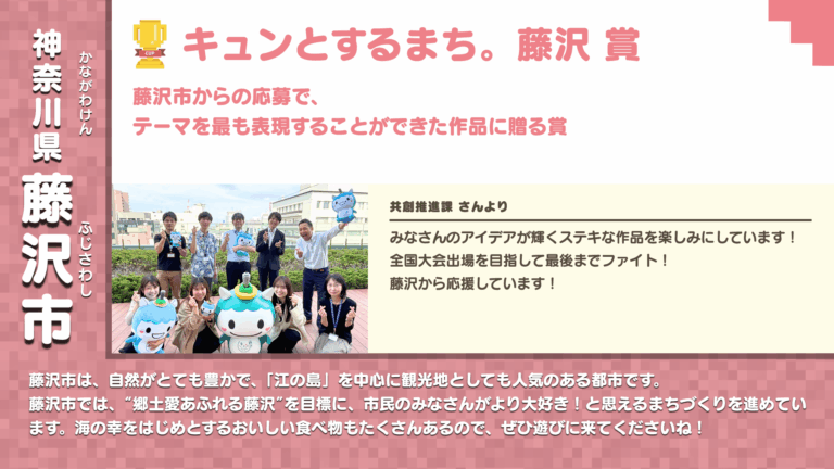| 審査方法 | 各地区の会場で1 チーム毎に、以下の内容を発表する審査会方式。 ①1分間の作品紹介動画の再生 ②2分間のスピーチによるプレゼンテーション ③審査員からの質疑応答 |