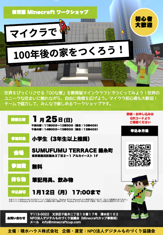 1月25日に「SUMUFUMU TERRACE 錦糸町」にて、「マイクラで100年後の家をつくろう!」ワークショップを開催します