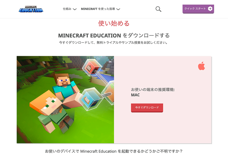 マインクラフトのアプリは公式サイトから無料でダウンロードできます。アクセスするとWindows用・MAC用・iPad用・Chrome Book用と端末ごとに最適なものが選択されていますので、そのまま「今すぐダウンロード」をクリックしインストーラーをダウンロードしてください。インストーラーを開いたら画面の指示に従って教育版マインクラフトをインストールしてください。