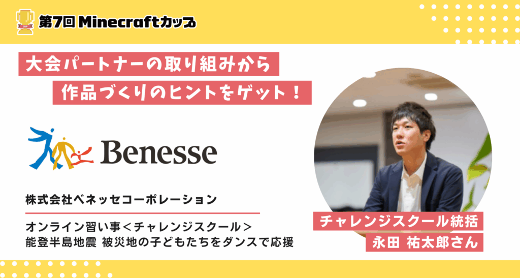 第7回Minecraftカップ ブロンズパートナー「株式会社ベネッセコーポレーション(以下:ベネッセ)」さんとMinecraftカップから、大会に参加する皆さんへ作品づくりのヒントや応援メッセージをお届けします。