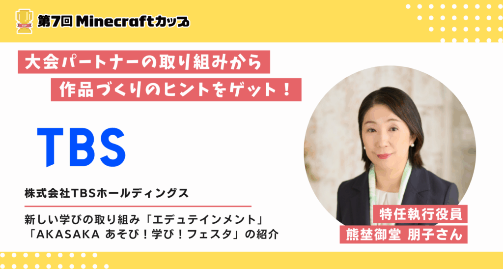 第7回Minecraftカップ ゴールドパートナー「株式会社TBSホールディングス(以下:TBS / TBSホールディングス)」さんとMinecraftカップから、大会に参加する皆さんへ作品づくりのヒントと応援メッセージをお届けします。