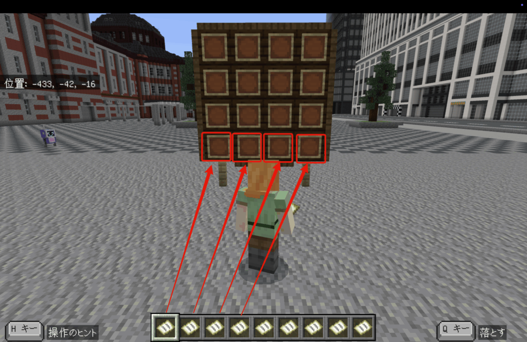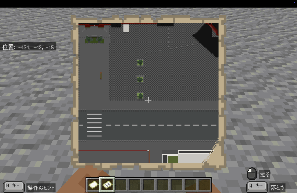 右クリックした時点で、プレイヤーの周辺の128×128ブロックが地図として作成されるため、画像のような4×4の額縁の場合、512×512ブロックの範囲を表すことができます。
