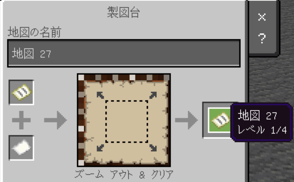 製図台に、地図と紙を置くと、レベルを1つ、上げることができます。レベルは0~4までの5段階あり、紙を使ってレベルを上げると、すでにあった地図の内容が消えるので、気をつけてください。(詳しくは、「マイクラ 製図台」などで検索しましょう)