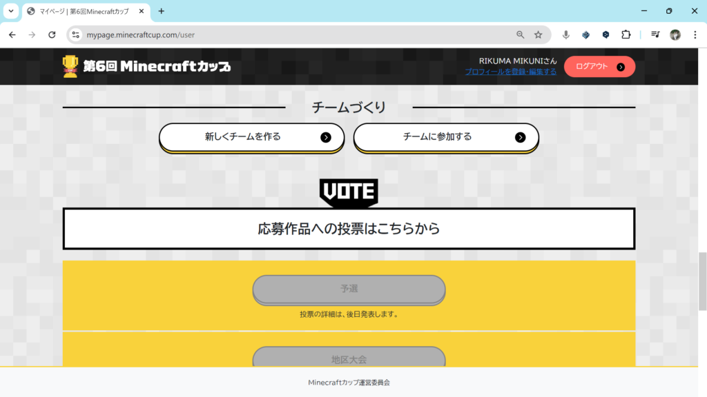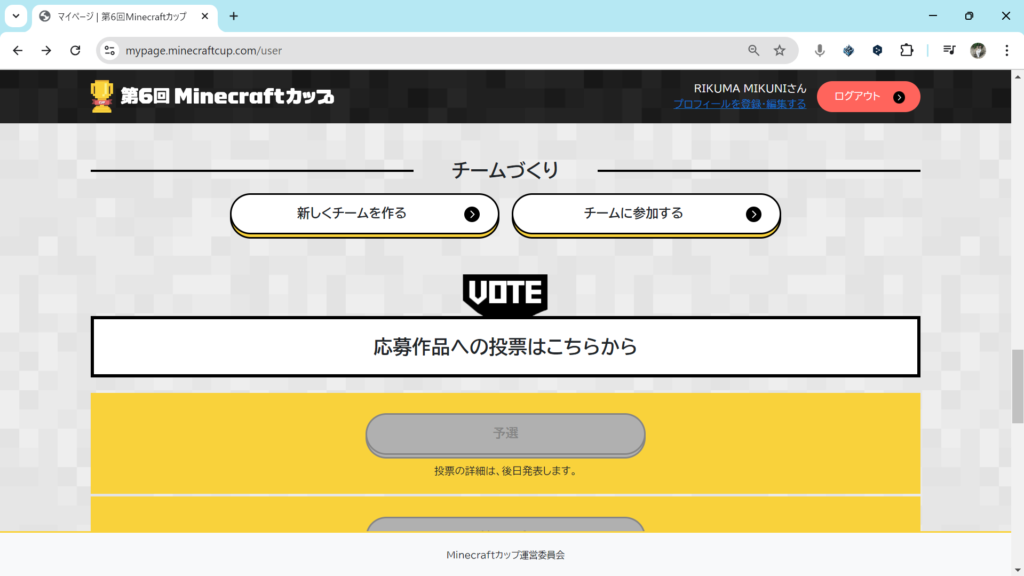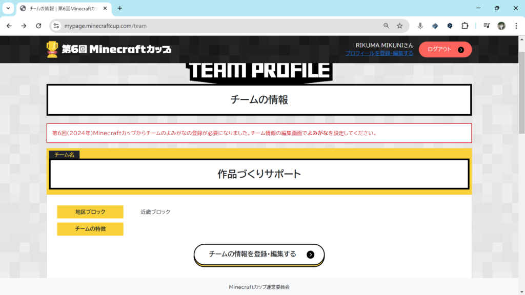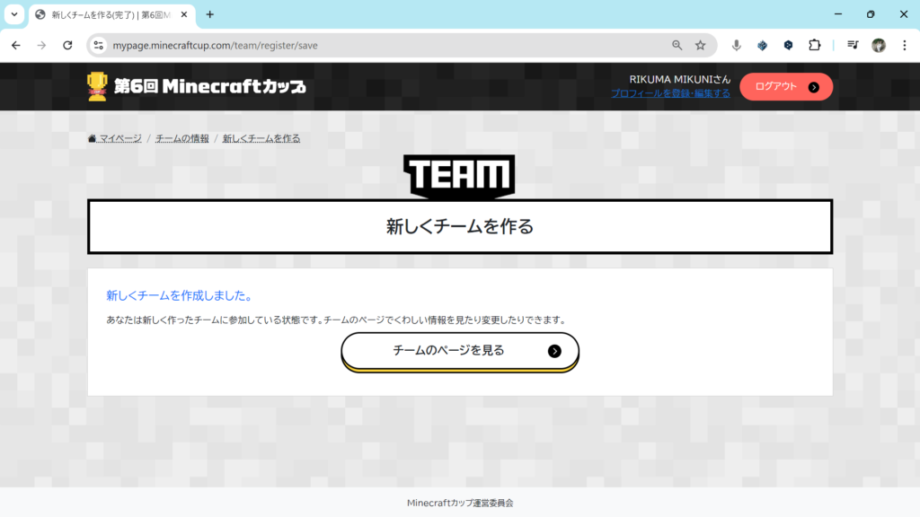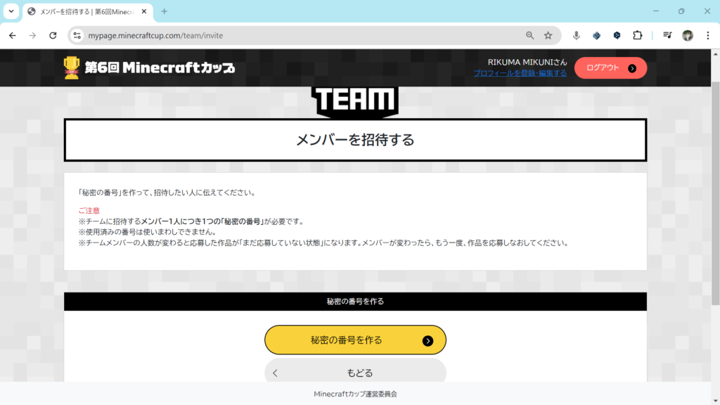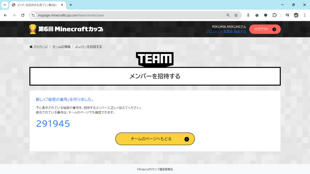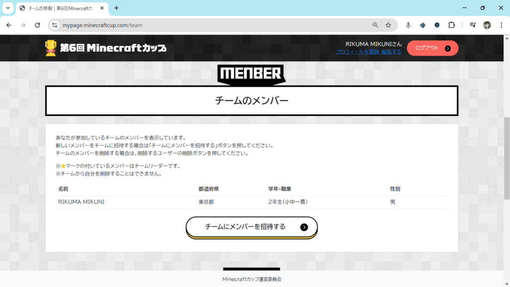 複数人でマイクラカップに挑戦している人は、いまつくったチームにメンバーを追加します。チームのページ内の「チームにメンバーを招待する」をクリックしてください。