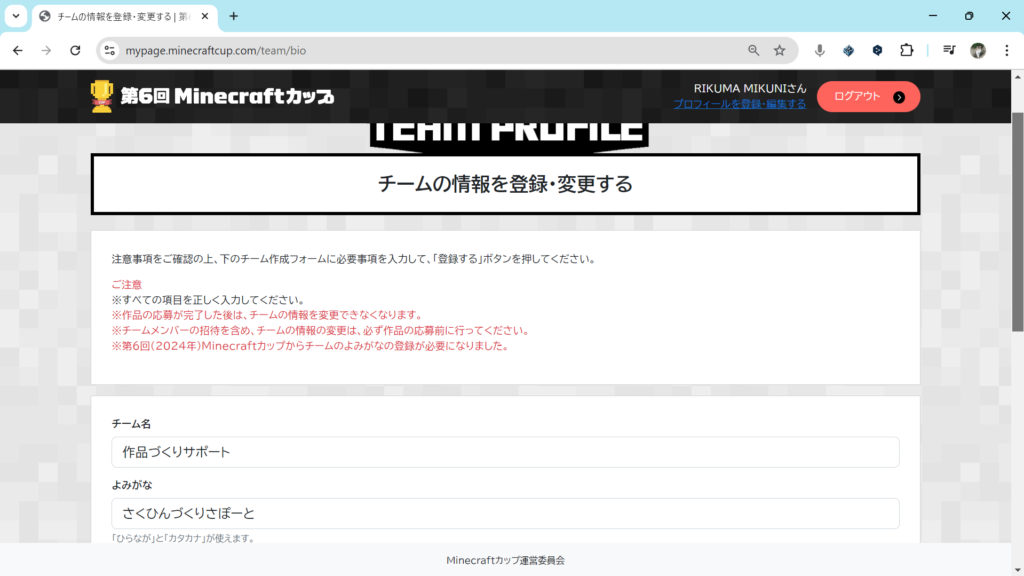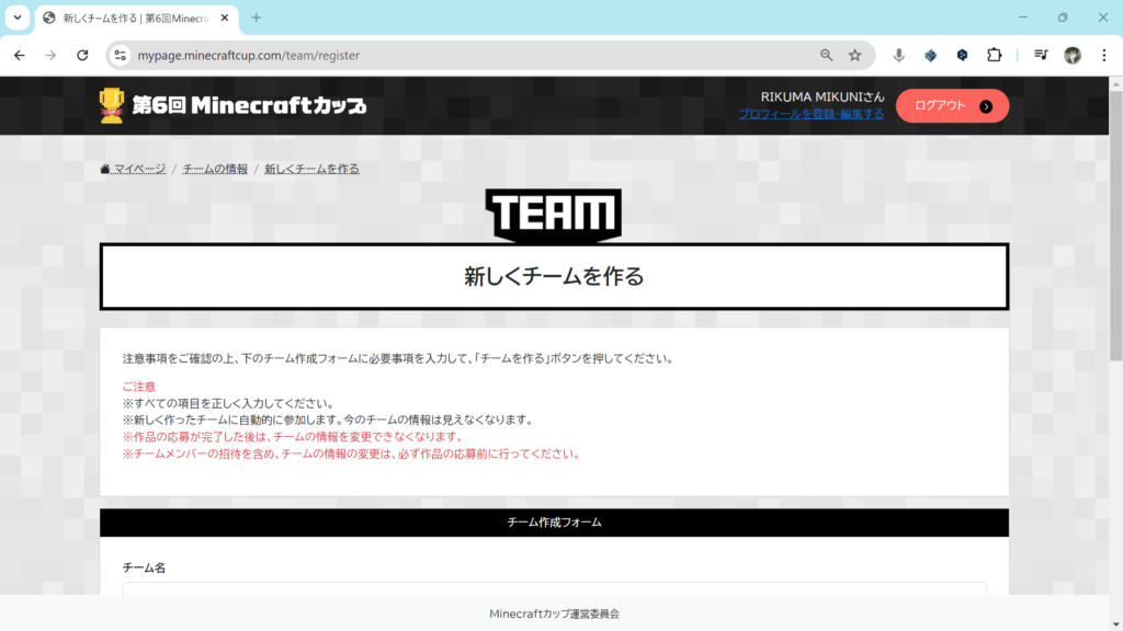 クリックをすると、注意事項とチーム作成フォームが表示されます。注意事項をよく読み、フォームの項目を入力してください。