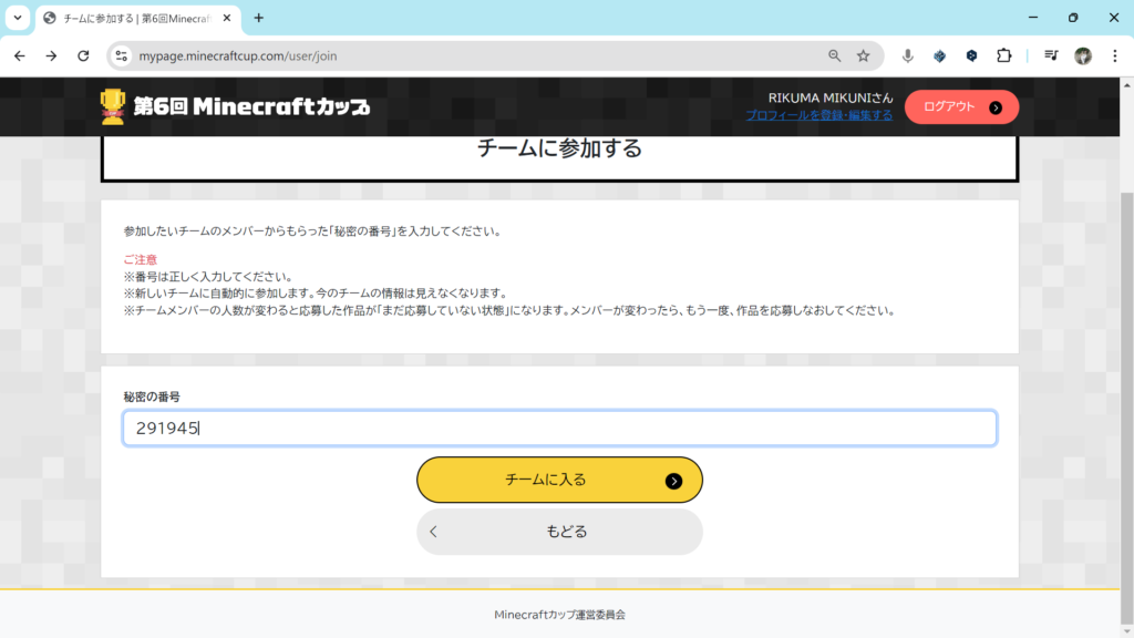 なお、秘密の番号は一度しか使用することができないので、3人が参加する場合は1人ずつこの作業を行ってください。
