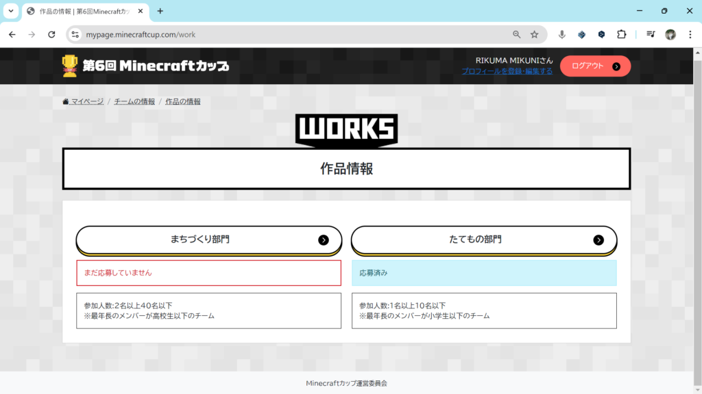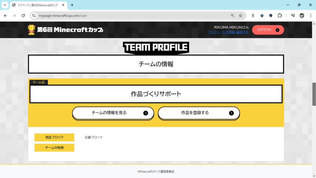 マイページの「チームの情報」欄の「作品を登録する」をクリックしてください。