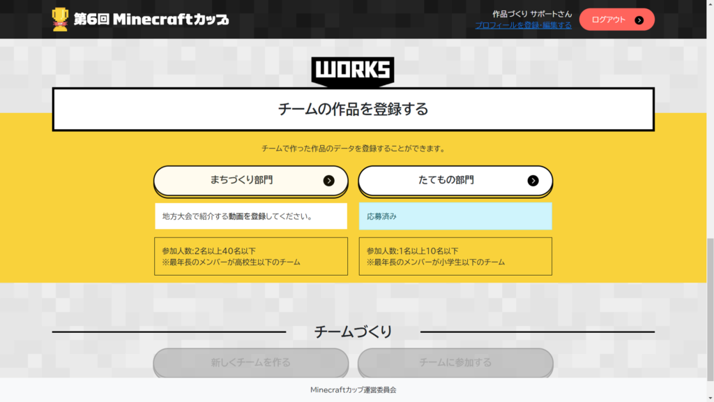遷移したページを下にスクロールして「チームの作品を登録する」の「まちづくり部門」をクリックしてください。