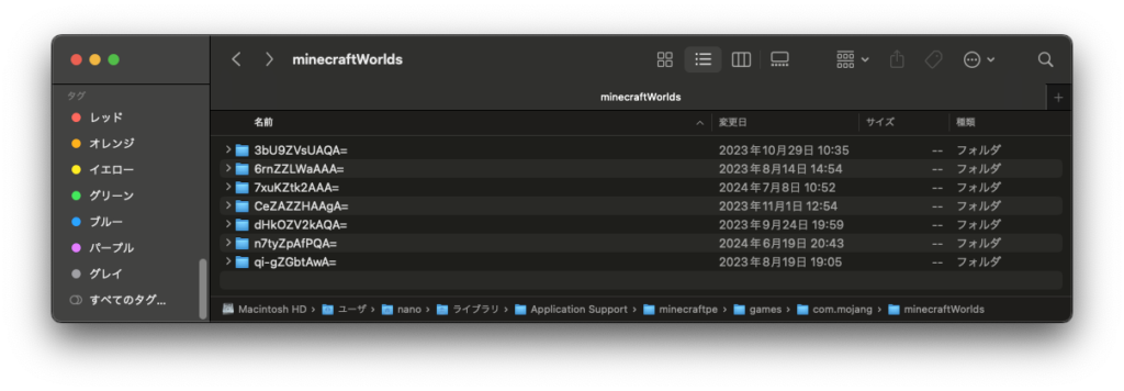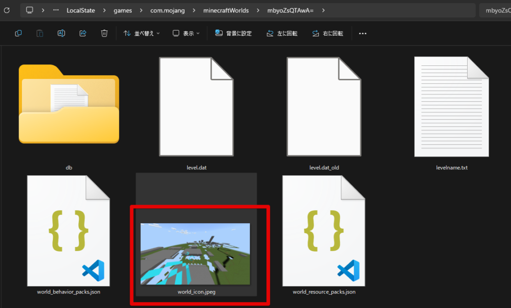 名前がランダムな文字列なので、どのワールドか確認したいときは、どれかフォルダをダブルクリックして、中に入っているアイコン画像を見るのがおすすめです。