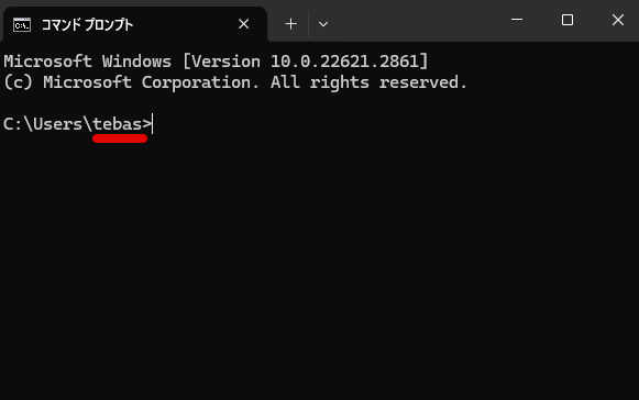 コマンドプロンプトを起動すると、写真のように表示されると思います。これの、Users\のあとの文字(赤い部分)があなたのユーザー名です。メモをしておきましょう。