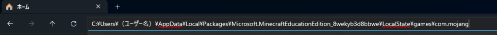 C:\Users\(ユーザー名)\AppData\Local\Packages\Microsoft.MinecraftEducationEdition_8wekyb3d8bbwe\LocalState\games\com.mojang