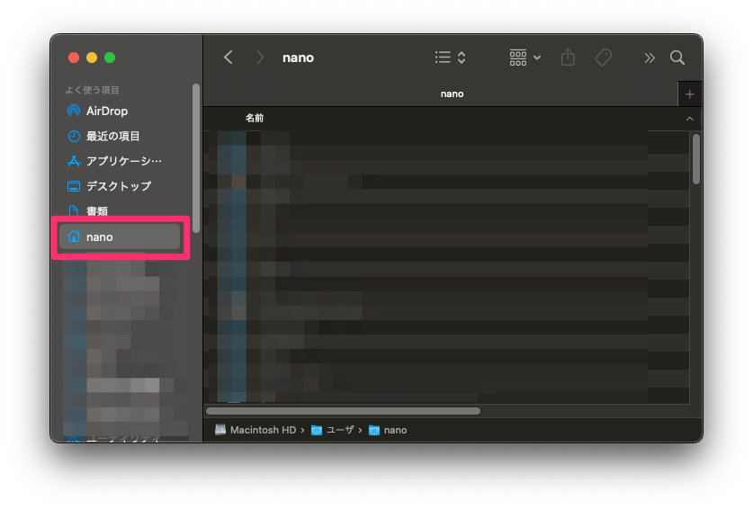 Macの場合、Finderを開くと、左に家のアイコンがあると思います。そこに自分の名前が書かれているので、メモしておきましょう。