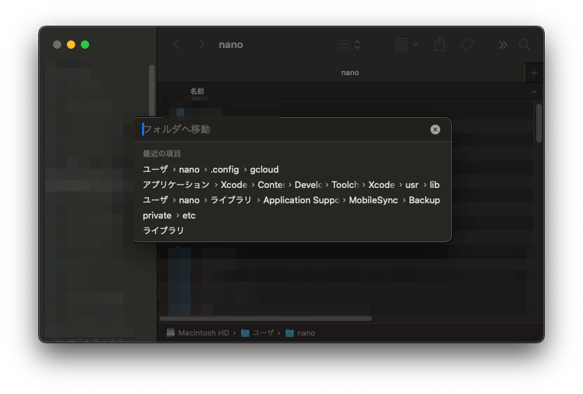 Finderを開いた状態で、「Commandキー + Shiiftキー + G」を同時に押します。すると、画像のような画面が出てくるので、以下の文字列を入力します。(ユーザー名の部分は自分のユーザー名に置き換えてください)