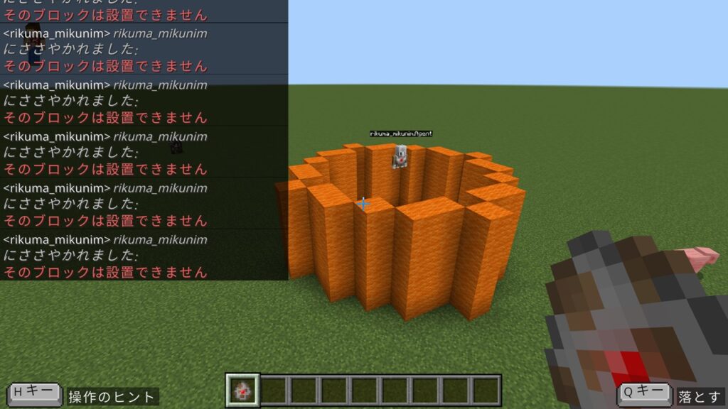 プログラムを動かすと、下の画像のように「そのブロックは設置できません」と表示されますが、円柱は問題なくつくることができています。
