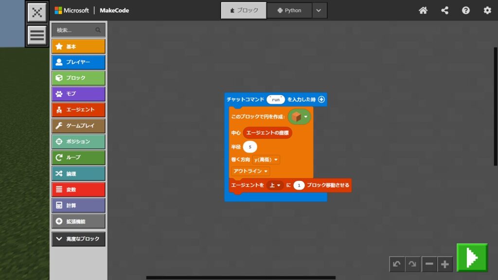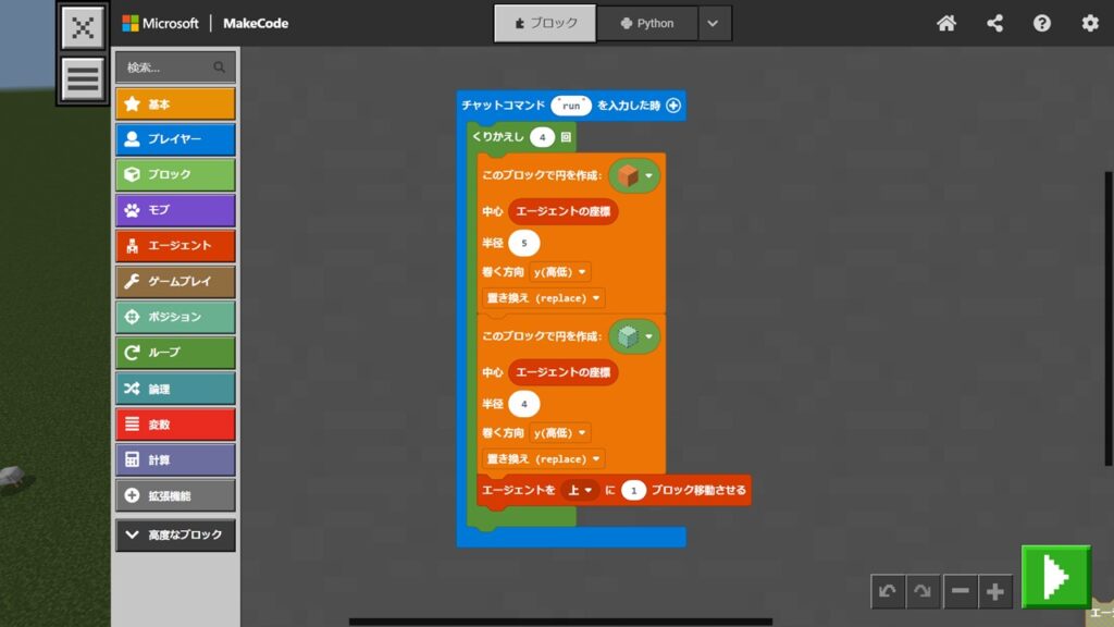 これでエージェントを中心に円をつくるMakeCodeをつくることができました。