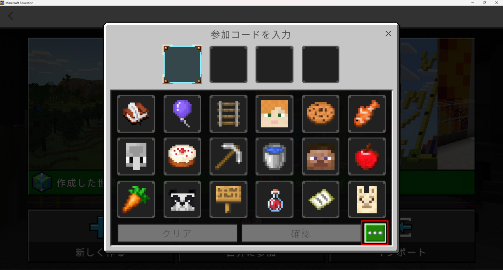 ホストから教えてもらった参加コードを順番通りに選択します。 「確認」ボタンをクリックするとワールドにログインすることができます。