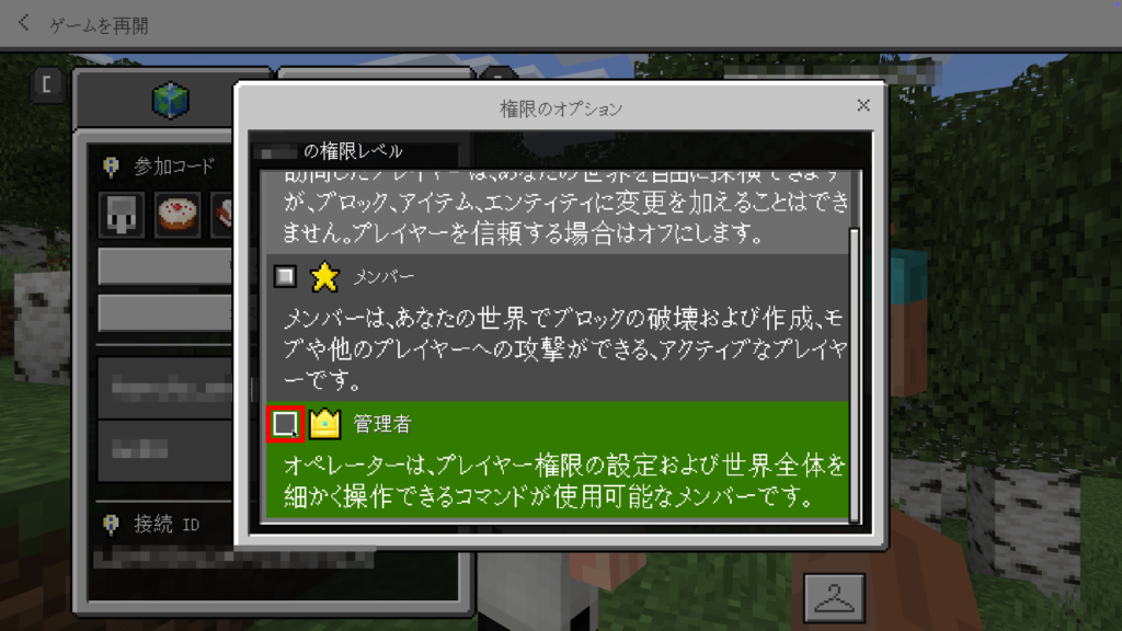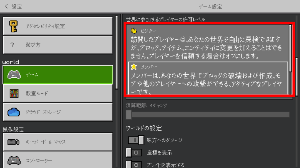 参加プレイヤーの権限レベルとは、マルチプレイにおけるワールド内のプレイヤーにどこまでの操作を許可するかを言います。