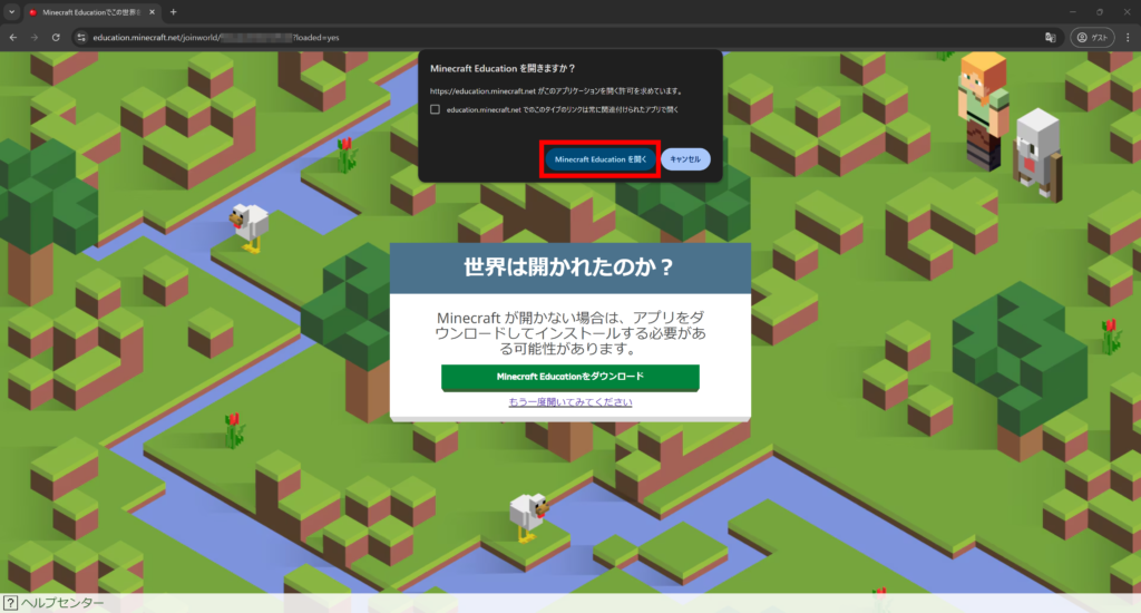 すると、以下のようなページが立ち上がるので、「Minecraft Educationを開く」などのボタンをクリックしてください。