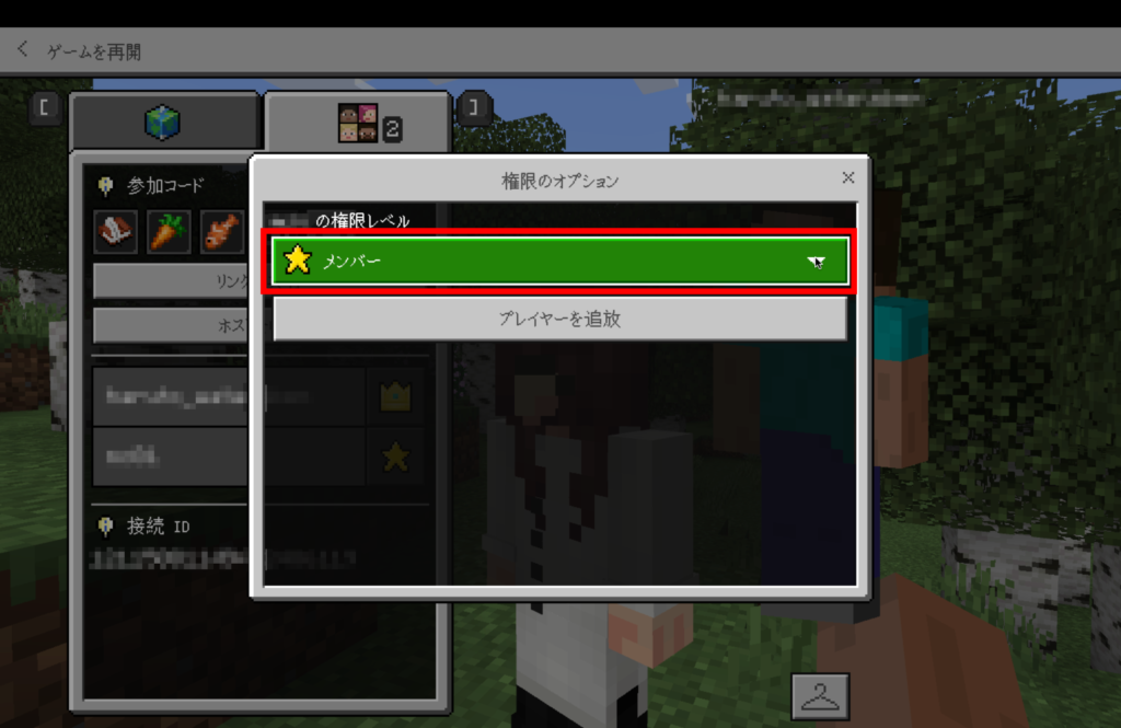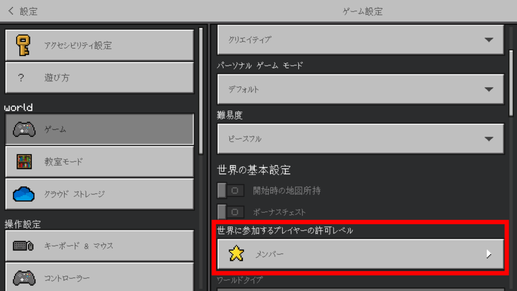 初期設定だと、ワールドに参加するプレイヤーには全員「メンバー」の権限レベルが与えられます。