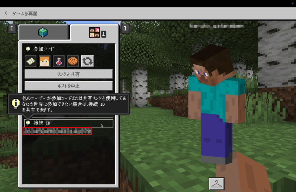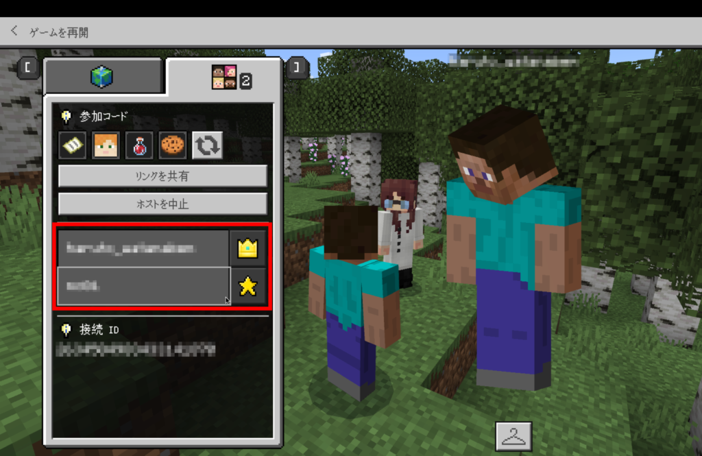 参加コードやリンクを共有する方が簡単にワールドへ招待することができます。それら2つの方法で他のプレイヤーが参加できない場合に、接続IDを共有すると良いでしょう。