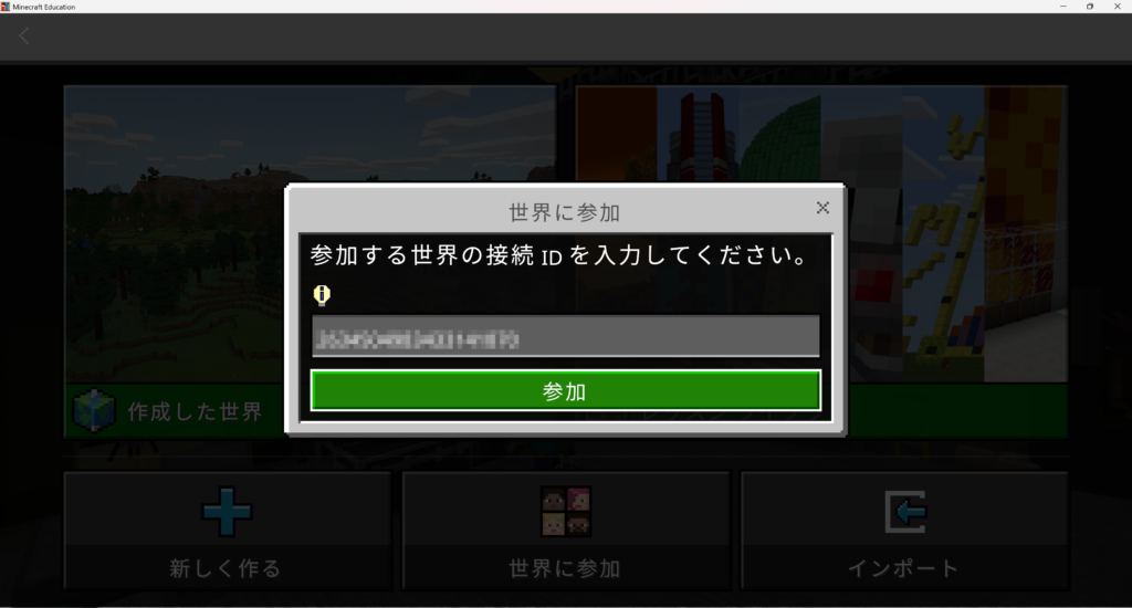 タイトル画面で「プレイ」ボタンをクリックし、「世界に参加」をクリックします。