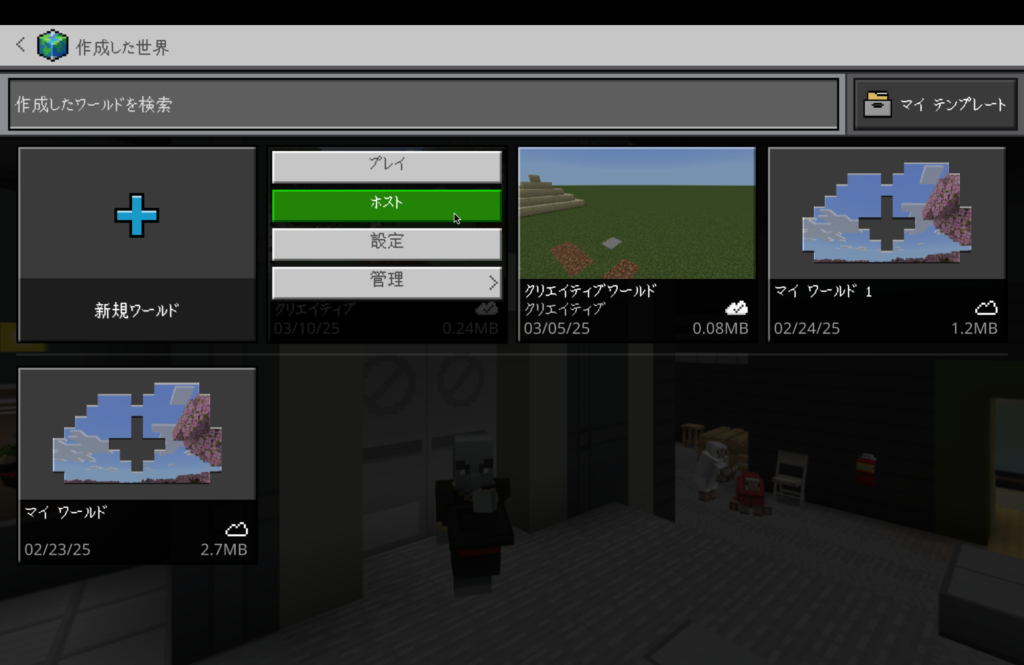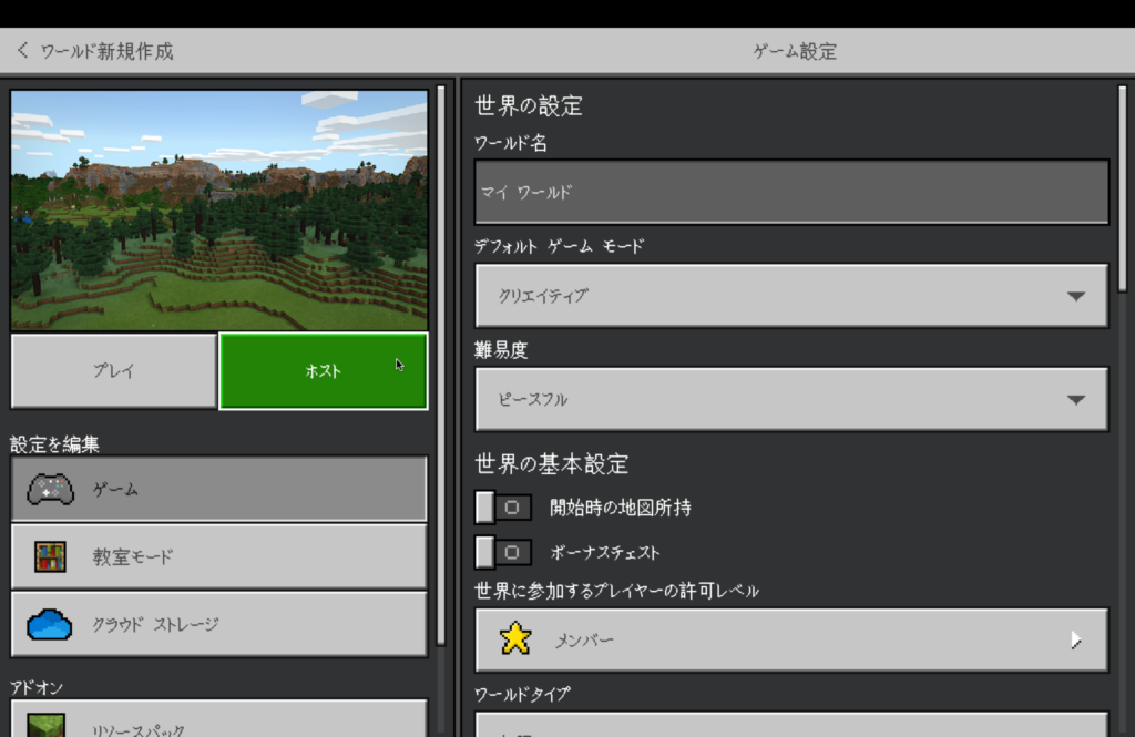 また、新規作成したワールドを開放する場合は、通常通りの手順でワールドを作成し、最後に「プレイ」ボタンではなく「ホスト」ボタンをクリックしてください。